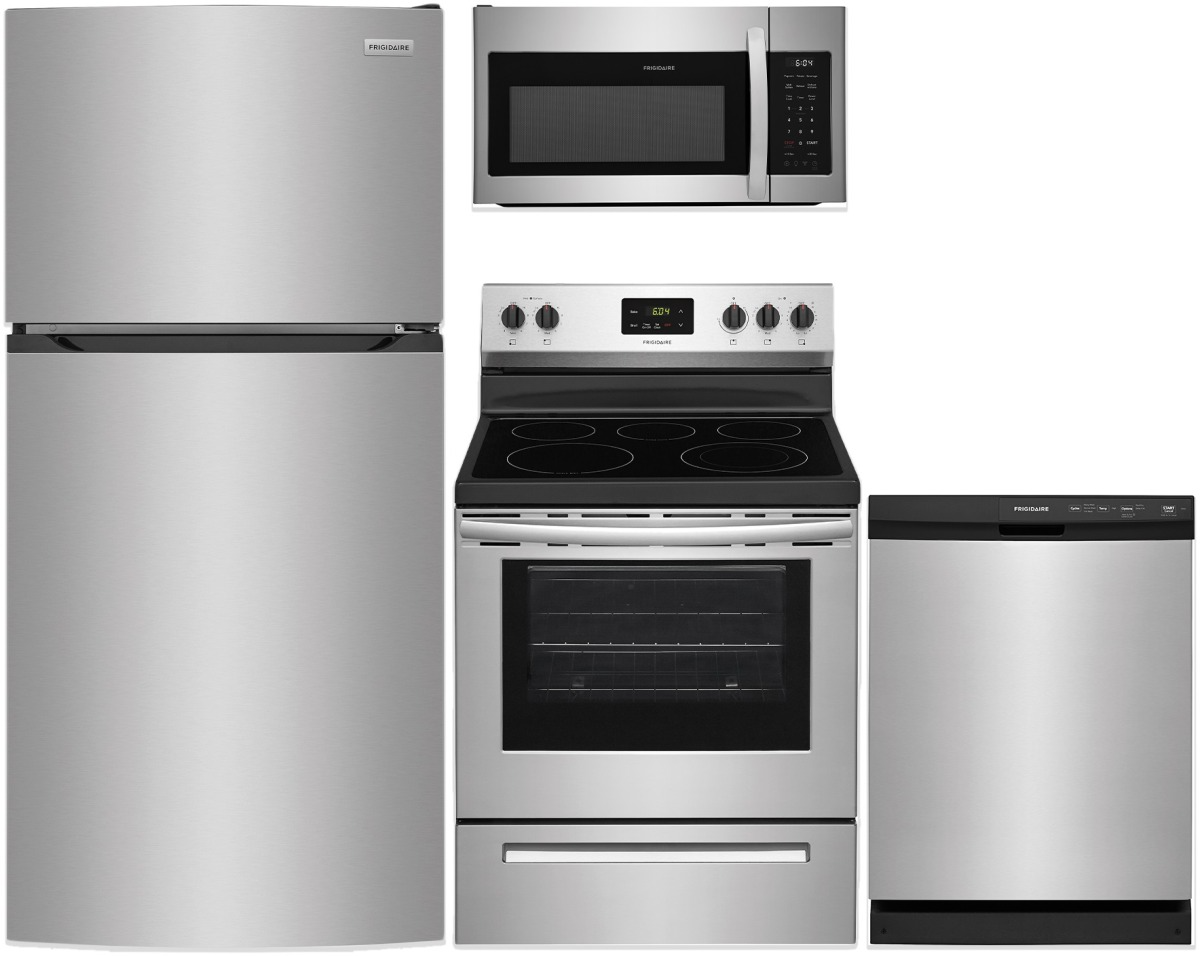 Frigidaire® 4 Piece Stainless Steel Kitchen Package with a built in dishwasher, over the range microwave, free standing gas range, and a top freezer refrigerator.Read More