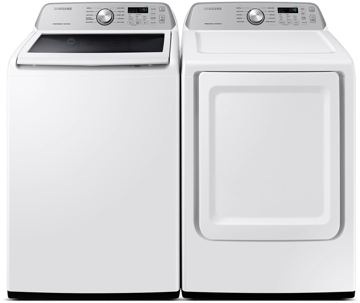 Samsung White Laundry Pair with a 4.4 cu. ft. capacity top load washer and a 7.4 cu. ft. capacity front load electric dryer.Read More