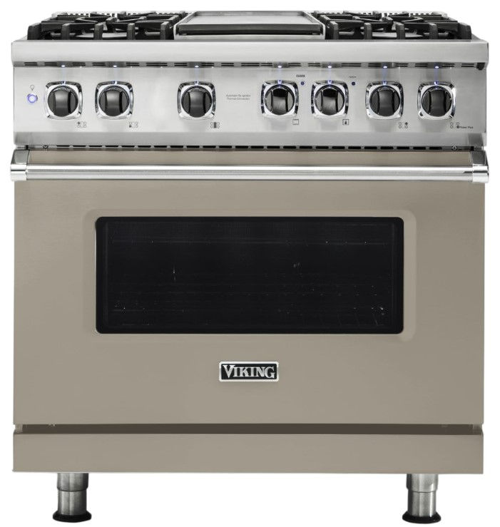 The Viking® 36'' Nantucket Dual Fuel Range features a sleek design, self-cleaning oven, and dual fuel technology, blending powerful gas burners with an electric oven for professional-grade cooking and elegant style in any kitchen.Read More